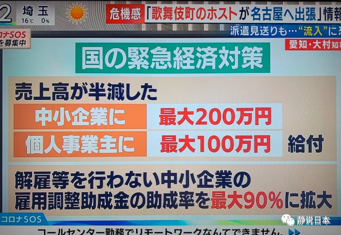 第一,作为国家,对于停业的中小型企业,一次性补助200万日元(约13万元人民币)、个体户企业一次性补助100万日元(约6.5万元人民币)。