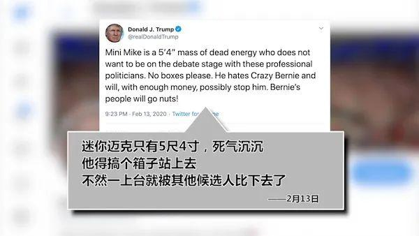 特朗普在这次竞选中,不遗余力地对布隆博格做出人身攻击,还给迈克·布隆伯格起了个外号:迷你迈克。
