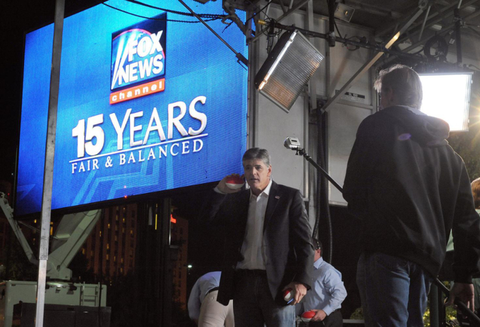 图:福克斯新闻主持人肖恩·汉尼蒂,其背后大屏幕上显示的正是福克斯新闻的口号“公平与平衡”。图源:美国《纽约时报》网站
