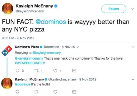 有趣的是,读书期间的麦克纳尼对于“达美乐披萨(Dominos)”可谓是情有独钟,自己在推上超过50次的怒赞这个品牌,称这是全纽约最好的披萨,达美乐的送货提醒,是我每天最大的动力。。。