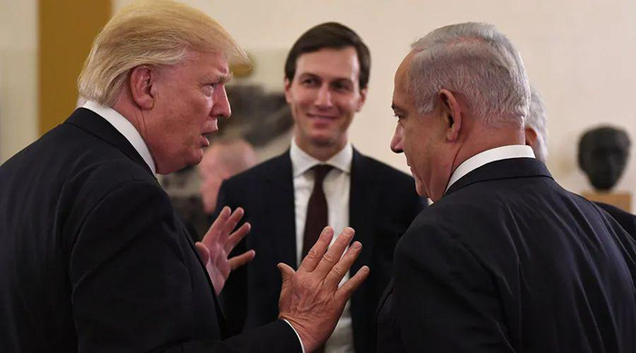(库什纳望着特朗普和内塔尼亚胡)
