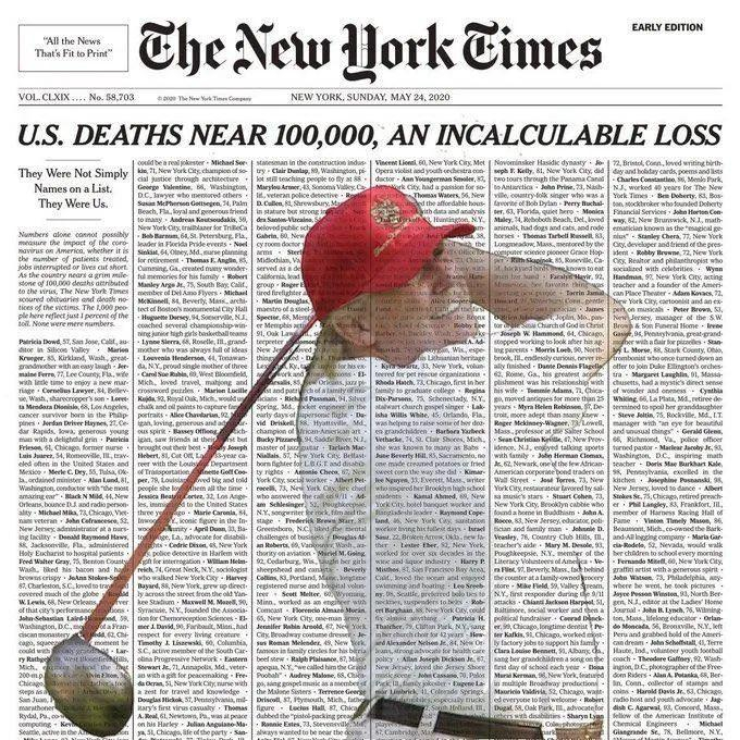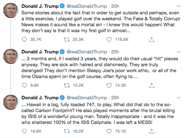 美国网友将特朗普打高尔夫的照片与《纽约时报》的新冠死者信息版面做了合成,以此讽刺特朗普。/推特美国民主党总统竞选人拜登在推特发布特朗普打高尔夫的视频,配文:“近10万个生命逝去,数千万人丢了工作,而总统却把时间花在打高尔夫球上。”面对如潮的批评,特朗普发3条推文回击,还顺带讽刺前任总统奥巴马:“奥巴马总是在打高尔夫,他动不动就坐着747客机去夏威夷打球了。”