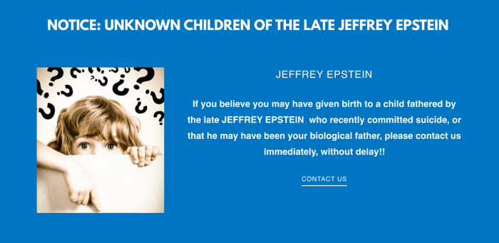 这家企业专门为全世界房产寻找未知的继承人。网站首页放着爱泼斯坦的照片,写着“法律通知:已故杰弗里·爱泼斯坦未知的孩子们”。该网站称,“如果你认为你可能为近期自杀身亡的杰弗里·爱泼斯坦生下过孩子,或是他可能是你的亲生父亲,不要犹豫,请立即联系我们!!”