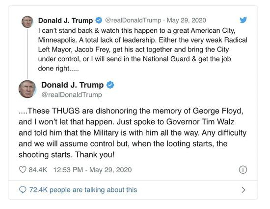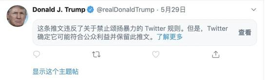 以至于推特都看不下去了,现在如果你打开川普的这条推特,你会先看到推特的警告:这条推文是在鼓吹暴力…