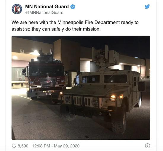 到了星期四,明尼阿波利斯市宣布进入紧急状态。州长调集来了国民卫队(national guard)来维持秩序。国民卫队相当于美国的预备役军队,可以由州政府指挥,在警察无法控制状况的情况下会被用于维持国内治安。