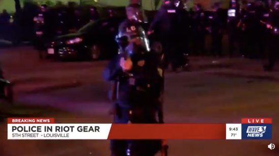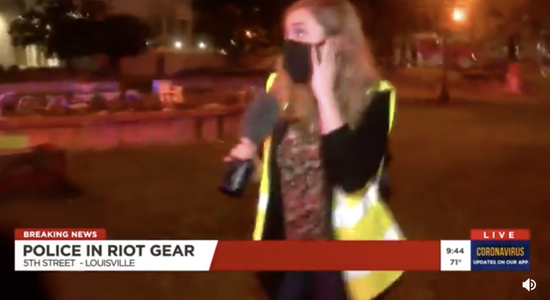 在肯塔基州路易斯维尔,一名NBC的女记者现场直播游行示威,就在直播过程中警察举着橡皮枪射击摄制组,