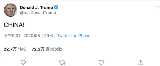 而昨天晚上,川普又莫名其妙地发帖,只有两个字:中国!