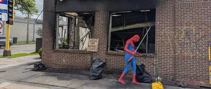蜘蛛侠街头打扫抗议者留下的废墟 这是美国的又一个早晨