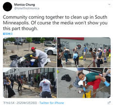 这是5月28号的一条推特,前一天明尼阿波利斯骚乱急剧恶化。推主说,“社区齐聚南明尼阿波利斯进行清理。当然,媒体不会向您展示这一部分。”