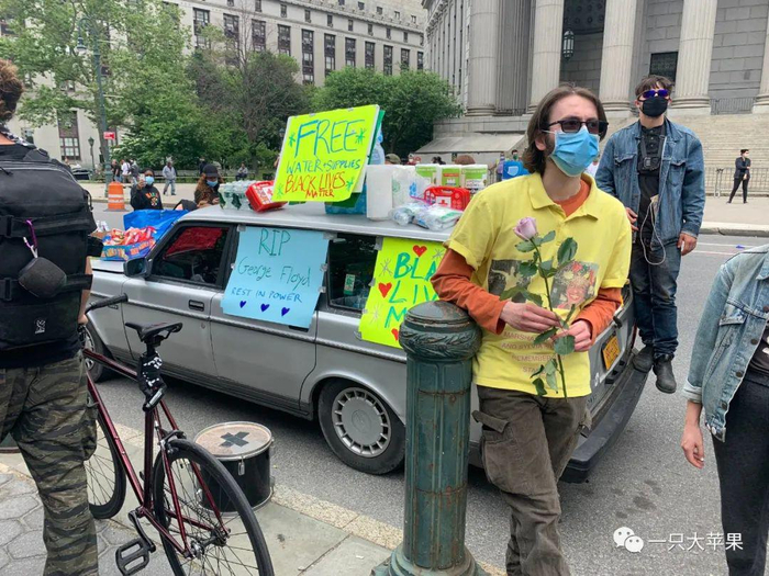 近万名示威者们大部分身穿黑衣,有的高举标语,有的呼喊口号,有的手持鲜花,还有人在现场为示威者们准备了免费的披萨、矿泉水和消毒防护用品。他们来自这个城市的四面八方,但却有着同一个诉求:反对警察过度执法,反对种族主义。