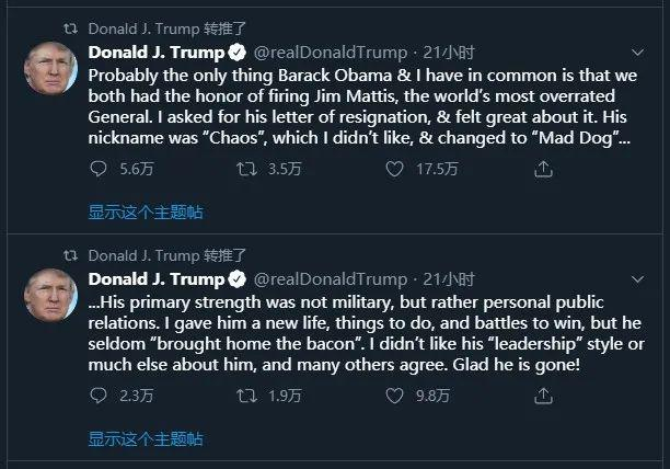 川普在第一则推文中写道:“也许我与巴拉克·奥巴马(Barack Obama)唯一的共同之处在于,我们俩都有幸解雇了全球最被高估的将军吉姆·马蒂斯(Jim Mattis)。”“我索要他的辞职信,对此感到非常高兴。”