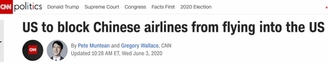 6月3日,特朗普政府计划从6月中旬禁止中国客运航班飞往美国。