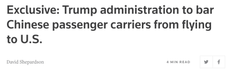 根据路透社的报道,由特朗普总统领导的美国政府于周三表示,将从6月16日起禁止中国客运航空公司飞往美国。