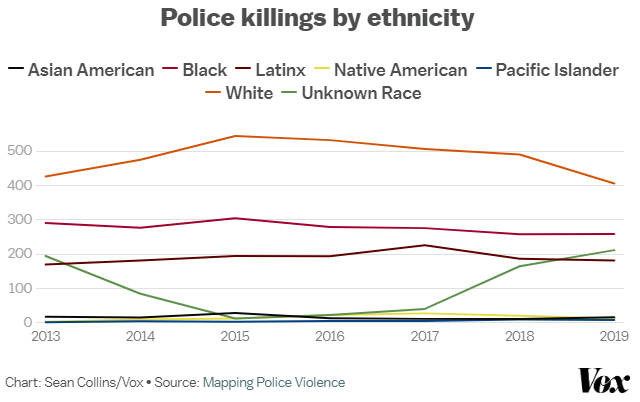 布鲁金斯学会研究员拉尚恩·雷(Rashawn Ray)表示,在未袭击他人或携带武器的情况下,黑人被警察杀死的概率是白人的3.5倍,黑人青少年被警察杀害的可能性是白人青少年的21倍,每40小时就有一名黑人被警察杀死,每1000名黑人中就有一名被警察杀死。