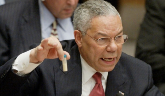 鲍威尔曾是当年那场伊拉克战争的积极推动者。2003年,他曾在联合国安理会上拿出一个装有不明物体的试管,表示伊拉克拥有大规模杀伤性武器。