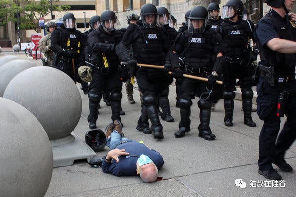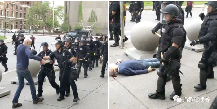 当时时间晚上8点多,布法罗警察在执行宵禁时,粗暴推倒了一位75岁的白发老人,导致后者头部着地,被送入医院治疗,还进了重症监护。现场视频显示得非常清楚,一群拿着警棍、穿着装甲的防爆警察正在街道上清场赶人。这名老人左手拿着一个警察头盔,右手拿着一个手机,迎上前去和警察理论,结果被两名警察当胸直接推倒在地。