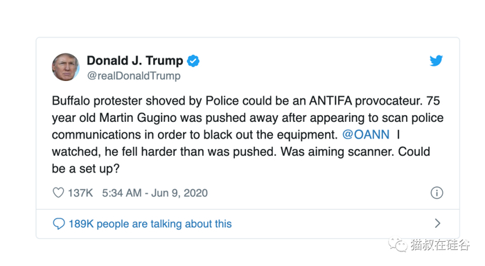 今天特朗普在推特上攻击:“布法罗被警察推倒的抗议者可能是一个ANTIFA破坏分子。75岁的马丁·古吉诺(Martin Gugino)在被推开之前,似乎想扫描警察的通讯设备,让设备失效。@OANN 我看了,他跌倒的幅度比推的大多了。之前就盯着扫描仪。这可能是圈套吗?”