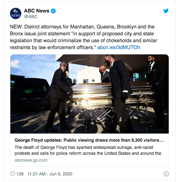 据ABC报道,曼哈顿、皇后区、布鲁克林区和布朗克斯区的地方检察官周二发表联合声明,称他们 “支持拟议的城市和州立法,将执法人员使用窒息和类似束缚手段定为刑事犯罪。”