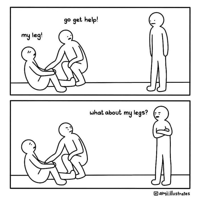 在推特上被广泛转发的一幅漫画用来比喻“黑人生命也重要”的议题:一个人前来帮助一个腿部受伤的人,呼喊到:“快帮忙。”而旁观站着的人却抱着双臂抱怨到:“也要关心一下我的腿。”(编者)