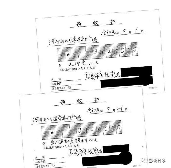 这笔钱不多,也就几十万日元(几万元人民币),日本一个公司职员一个月薪水。但是如果要上纲上线的话,那就是违法,因为选举期间所有的人规定只能是做“义工”,领取的报酬,也只能是补贴。譬如,选举事务所的工作人员的每天报酬,不得超过1万日元(约650元人民币)。跟着候选人开车到处喊话的女性宣传员,一天的报酬规定不得超过1万5000日元(约990元人民币)。但是,河井夫妇给每位宣传员一天付了3万日元。搜查本部手里捏着宣传员们领取钱的发票——铁证如山。