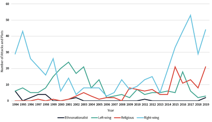 最后,尽管恐袭造成的死亡中大部分都与宗教极端分子有关(受“9·11”事件影响),但在有致命恐袭记录的21年中,有14年半数以上死亡都是由右翼恐怖分子造成的。