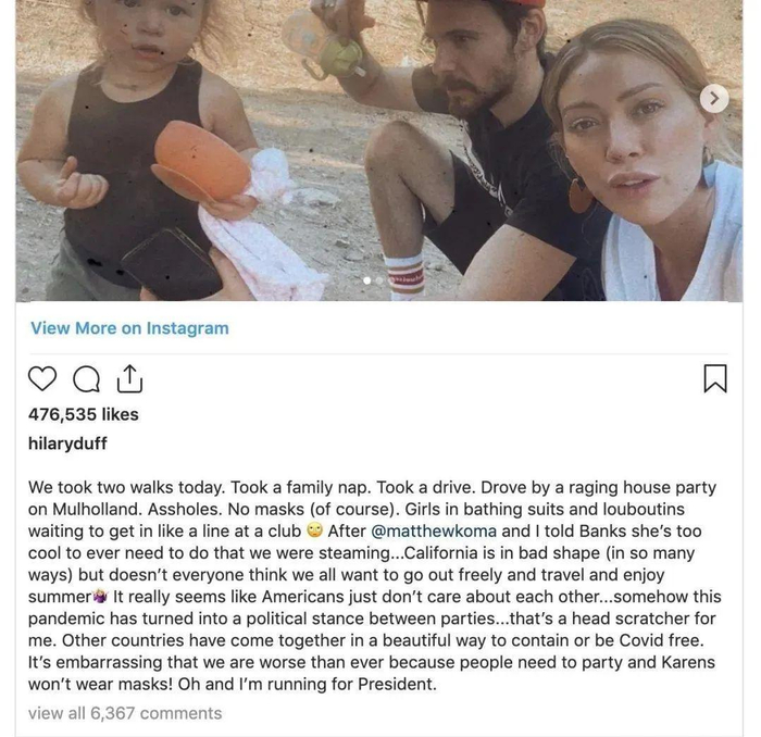 美国女演员、歌手希拉里•达芙上周日在Instagram上分享了自己对新冠肺炎爆发如何影响美国的看法,批评疫情成为了政党表达政治立场的工具。她说:“其他国家都在为了遏制疫情而团结在一起,尴尬的是,我们却比以往任何时候都要糟糕,人们喜欢开派对,而且还不戴口罩…哦,我也要竞选美国总统了。”