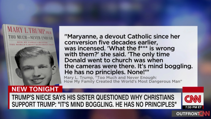 书中提到,特朗普的姐姐质疑基督徒们为什么要支持特朗普,说他去教堂只是为了上镜头。(图片为CNN截屏)