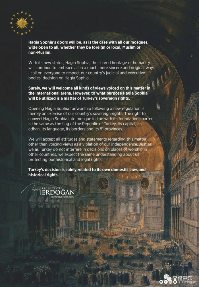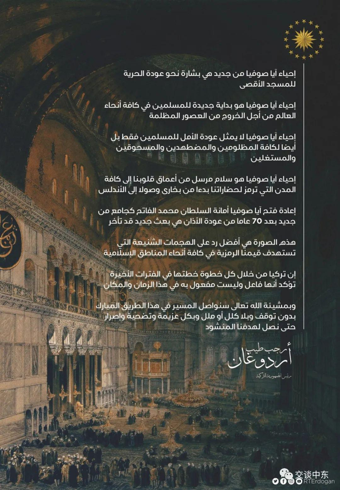 但在面向穆斯林的阿拉伯文声明中,他则强调:圣索菲亚的“复活”是阿克萨清真寺走向自由的标志,是向所有象征我们文明的城市——从布哈拉到安达卢西亚的问候。