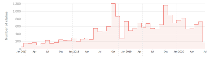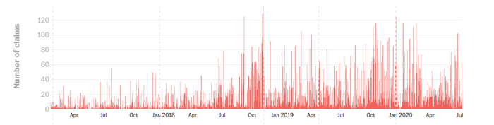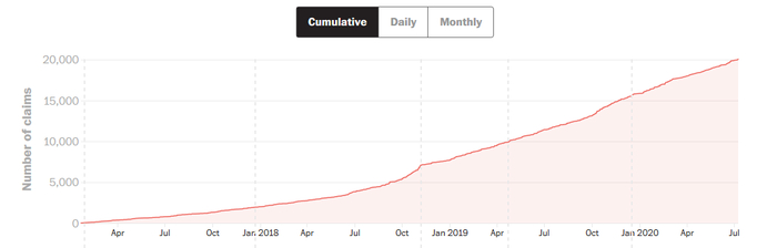 华盛顿邮报为此专门建立数据库,总结特朗普上任以来所有的误导性言论和谎言。截止现在的1267天任期里,特朗普说谎20055次,内容涵盖执政的方方面面,包括经济、边境墙、减税、贸易、北约、通俄门、通乌门、弹劾、大选、拜登、拥枪权等等,现在又新增了疫情和黑人抗议。