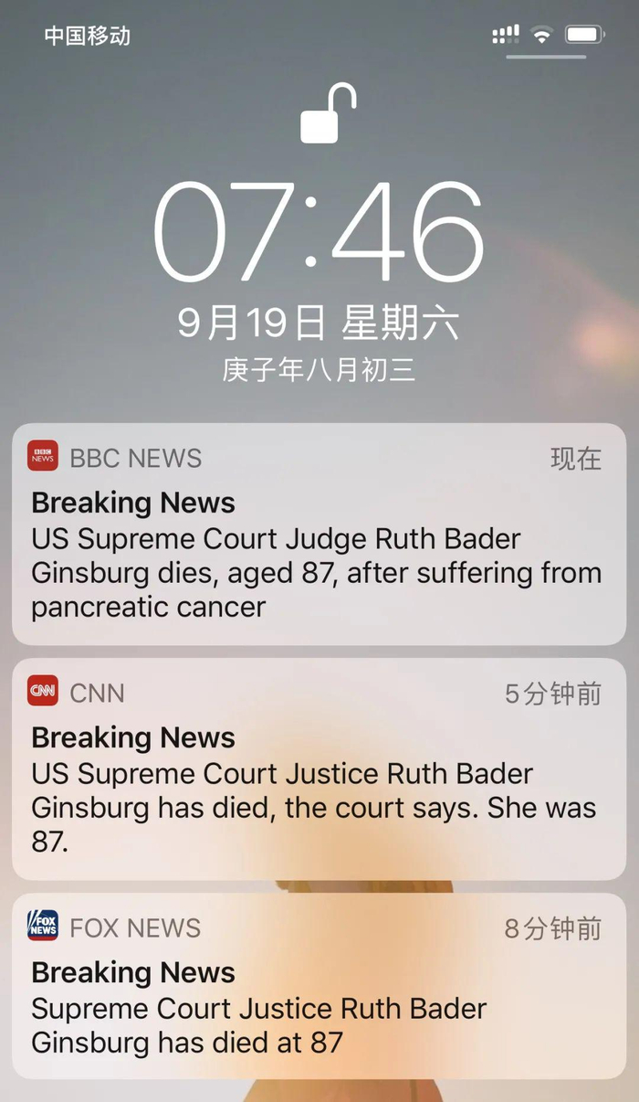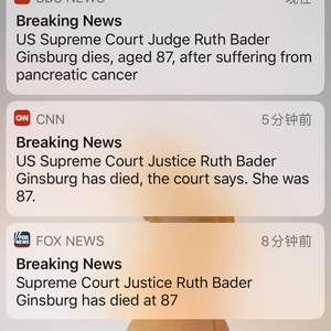 据路透社、BBC、CNN、FOX等多家外媒报道,美国最高法院大法官露丝·巴德·金斯伯格去世,终年87岁。