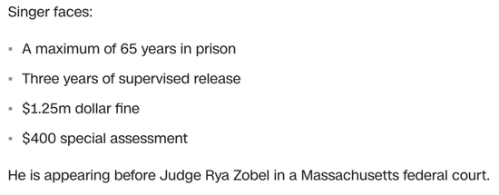 在2019年3月,辛格对欺诈、敲诈勒索和洗钱等罪证供认不讳。虽然,对辛格判决尚未确定,他的判刑日期也暂未公布,但他可能会面临最高65年的监禁、高达125万美元的罚款等判决。
