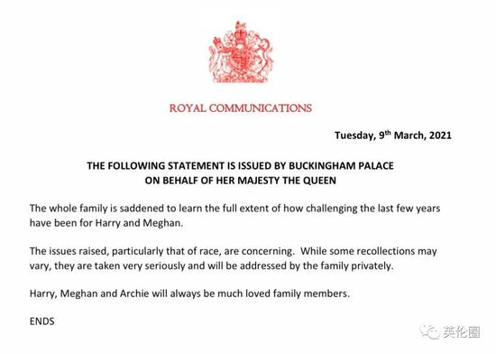 不久前,也就是伦敦时间3月9日下午5点半左右,白金汉宫(Buckingham Palace)代表女王发表声明,对梅根哈里和奥普拉的访谈内容此做出了回应: