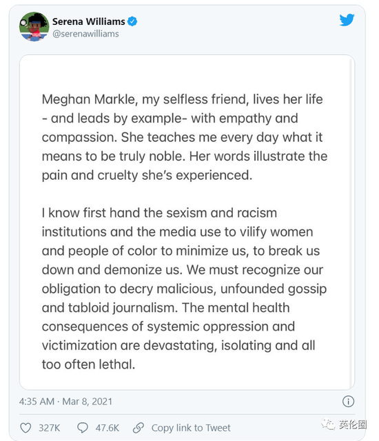 女子网球运动员塞雷娜·威廉姆斯(Serena Williams):“我无私的朋友,梅根·马克尔带着同理心和同情心以身作则,过自己的生活,她每天都在告诉我,什么是高尚。她的话语里表露了自己所经历的痛苦和残忍。。。”“。。。我知道,性别歧视和种族歧视机构以及媒体用丑化妇女和贬低有色人种来贬低、摧毁、妖魔化我们,我们必须要认识到我们有义务谴责那些恶意的、毫无根据的流言蜚语和小报消息。。。”