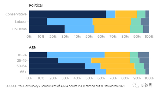 但从年龄来看,支持梅根的年轻人偏多,18-24岁的人群支持梅根哈里的比例占48%;65岁以上人群支持梅根哈里的仅占9%,支持王室的占55%。