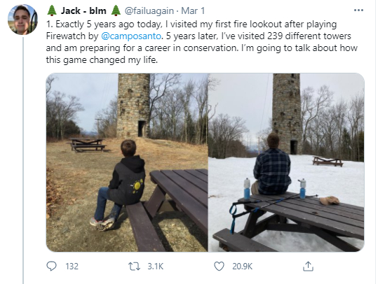 很少有文艺作品会将大众与这个少见的职业联系起来,因此《看火人》的氛围在当时另人耳目一新,甚至让人心向往之——其中就包括这位名叫Jack的玩家。12岁那年,他偶然打开自己的PS4,点开了这款刚发售不久的游戏,用一个下午的时间打完它,并因此改变了自己后来的人生。