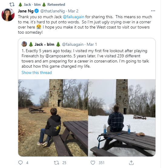 一周前, Jack在推特上分享了自己最近五年的经历——因为受到《看火人》影响,他在五年里探访了239座瞭望塔。在十几段叙述中,他讲述了自己在16年从《看火人》里认识了瞭望塔,并在长达五年的奔波之后,决心将它作为自己今后的研究学习方向。