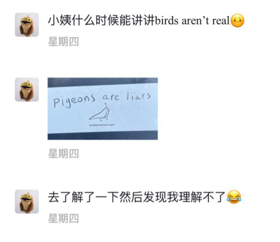 比如前两天,一位粉丝就要求小姨讲讲“birds aren't real”是什么意思。