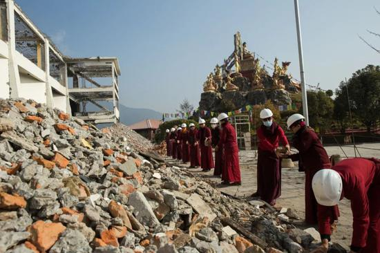 徒步旅行还有意外收获,那些在路边休憩的受伤动物。尼姑们照顾治疗它们,带着它们一块徒步,并带回加德满都。2015年,尼泊尔发生了7.9级的地震,她们是当地第一批的救灾人员。山体滑坡和余震产生的碎石堵塞了道路,就靠徒步把援助物资送到需要的村庄里。