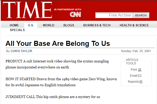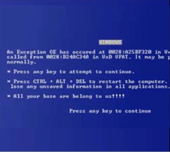 音频之后该有视频了,以当时的网速条件,Flash动画是最理想的视频传播媒介。2001年2月15日,Tribal War论坛上的网友Bad_CRC上传了Flash动画《All yor base r blong 2 us》。