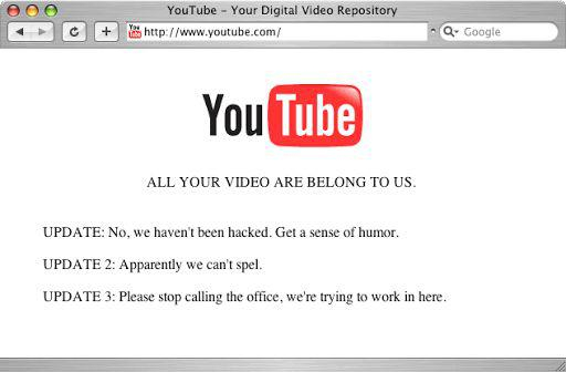 2006年6月1日,Youtube网站维护更新,并在网站首页摆出了“ALL YOUR VIDEO ARE BELONG TO US”(你们的所有视频属于我们)的字样,遭到质疑后还补了一行字,并向主流媒体表示,他们没有被黑客攻击,这只是程序员的幽默感。