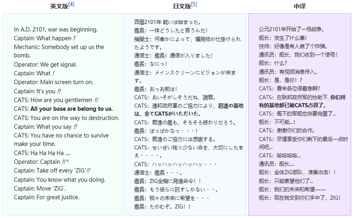 被奉为经典的“All your base are belong to us”即是出自CATS头目之口。在这句话里,作为名词的“基地”(base)没有应用复数形式(bases),且belong to本就是自成体系的动词短语,没有必要与be动词“are”连用。