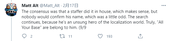也有人想要找到一切的源头:负责《零翼战机》MD版英文本地化的团队。AltJapan本地化公司的创始人之一Matt Alt,在庆祝AYB梗20周年的推文中称,他曾经在五年或更久的时间以前,联系过东亚企划的前员工(东亚企划于1994年破产)。