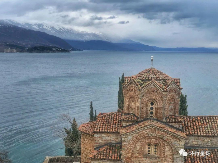 圣约翰教堂就是给我种草北马其顿的地方了,位于湖边凸出的一角上,黄色的墙面已经很斑驳,不太规则的圆形窗子也诉说着教堂的高龄,衬着背后清澈的湖水和雪山,这种遗世独立的感觉,绝对是奥赫里德湖最美的观景点。