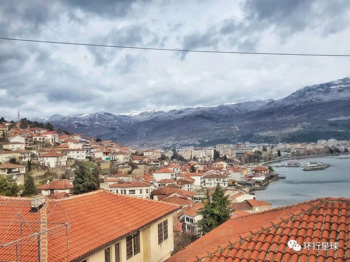 即使是冬天,奥赫里德湖也清澈见底,远处的黑色山峦在云朵后若隐若现,配上深绿色的湖水,像一幅山水水墨画。向小镇方向看,层层叠叠的橘色屋顶和白色墙体又给这幅水墨画增添了油画的质感。