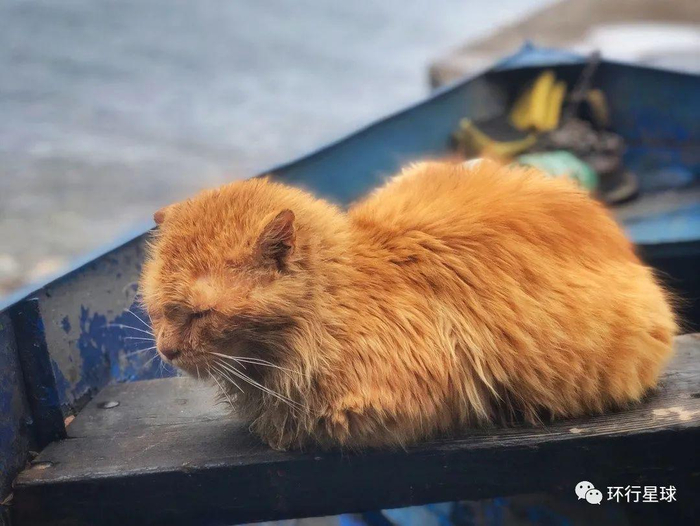 虽然没有海边的沙滩,但有不少石滩,石子大都被冲刷得没有了棱角,踩上去也很舒服。因为天气太冷,无论是观光游船还是彩色小木船都停泊在岸边,小木船则成了猫猫的开心乐园。