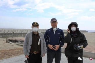 三一一地震后不久,《联合早报》东京特派员符祝慧(右)跟随田尾阳一教授(中)的辐射测量队伍进入福岛核电禁区交界处。(符祝慧提供)
