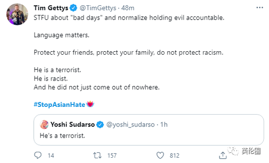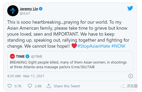 林书豪也发了推特:“这真是令人心碎。。。为我们的世界祈祷。对于亚裔美国人,可以花一些时间来悲伤。。。我们必须继续站起来,大声说出来,团结起来,为改变而战。我们不能失去希望!❤️#StopAsianHate#Now”