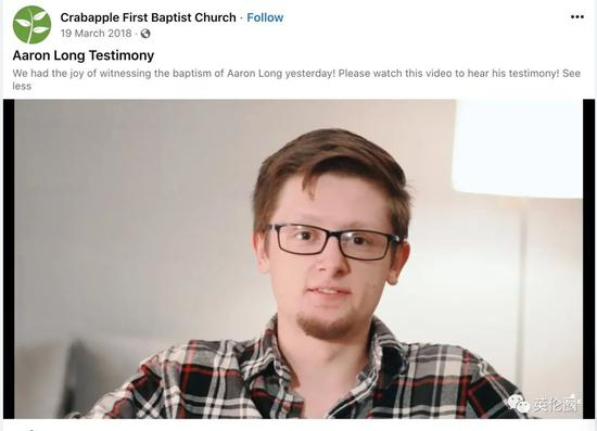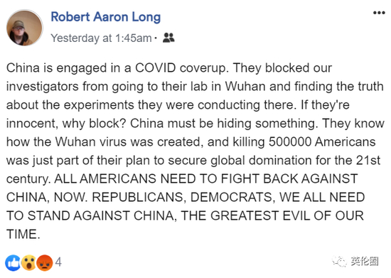图:Twitter嫌疑人的父母和妹妹都在这家教会,嫌疑人的母亲还曾在教会组织活动,此外,网上还流传着一张Robert Aaron Long的Facebook动态截图,表达了“中国掩盖新冠”,“中国是时代最大祸害”,“美国人应该反击中国”等等内容。但有网友质疑其名称蓝色字体位置和字体很不自然,类似P图效果。该脸书账号也”消失“了。