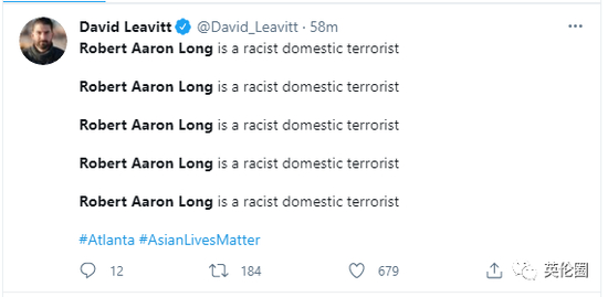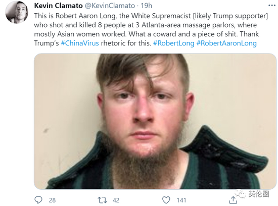 “这就是Robert Aaron Long,一个白人至上主义者(很有可能支持川普),他在亚特兰大地区的三家按摩店开枪打死了8人,很多亚裔女性在这里上班。他是个懦夫和混蛋,感谢川普的‘中国病毒’言论啊”