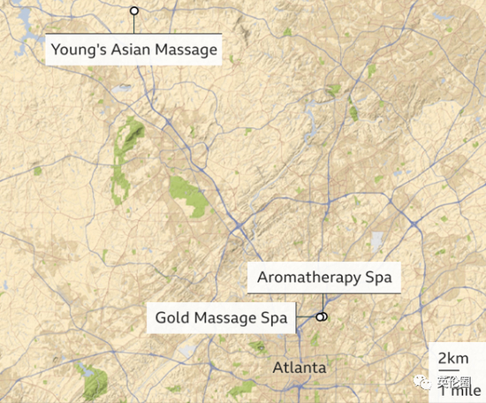 3家按摩店的位置:BBC新闻昨天下午4点50左右,杨氏亚洲按摩店(Young’s Asian Massage)传出枪声,有2人当场身亡,3人重伤,重伤的两人随后抢救无效去世,脱险的重伤者为拉美裔。